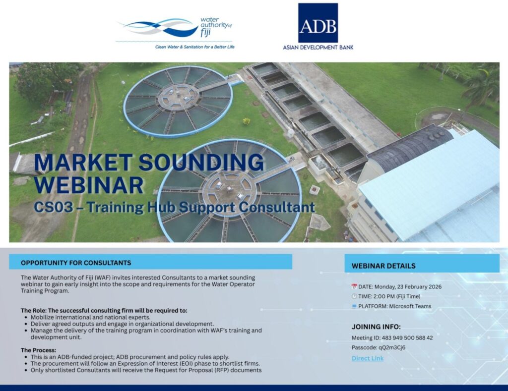 The Water Authority of Fiji (WAF) invites Consultants to a market sounding webinar regarding the ‘CS03- Training Hub Support Consultant’ project.